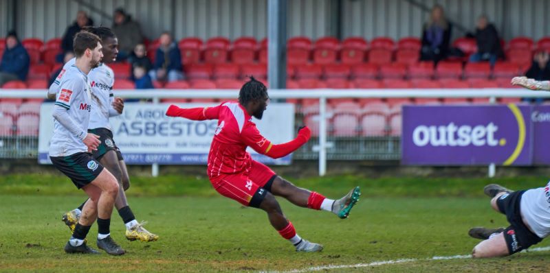 Joshua Shonibare’s first goal in red and a Mackenzie Foley penalty save sealed a statement 3-1 away victory over league leaders Dover Athletic in the Isthmian Premier Division on Saturday.