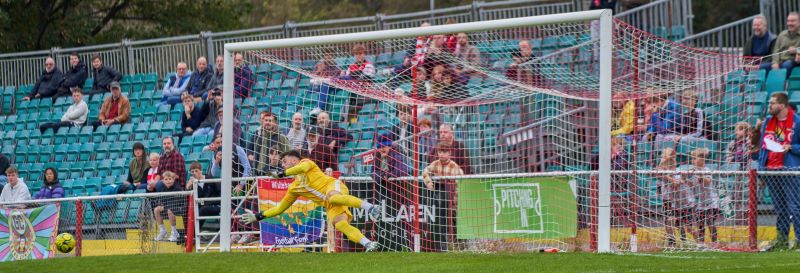Charlie Lambert stepped up and placed his penalty to Kerbey’s right. Although the Carshalton keeper got a hand to it, he couldn’t keep it out – giving the Hawks an early advantage.