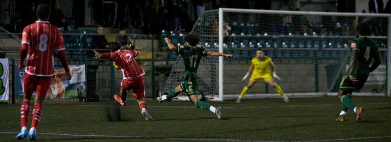 Despite Carshalton’s early pressure, it was the hosts who struck first. On 19 minutes, former Robin Stefan Ilic picked up the ball outside the box and curled a brilliant strike into the far corner to give Whyteleafe the lead. It was a setback for the visitors, but they responded with more attacking intent. Lucas Dyer made a strong run but couldn’t hit the target.