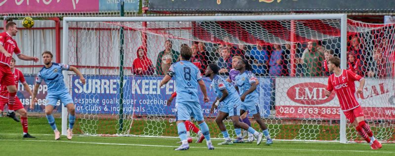 Just three minutes later, however, Carshalton got their breakthrough. Bradford’s corner from the right was initially cleared, but only as far as Luke Read, whose glancing header found the corner of the net.